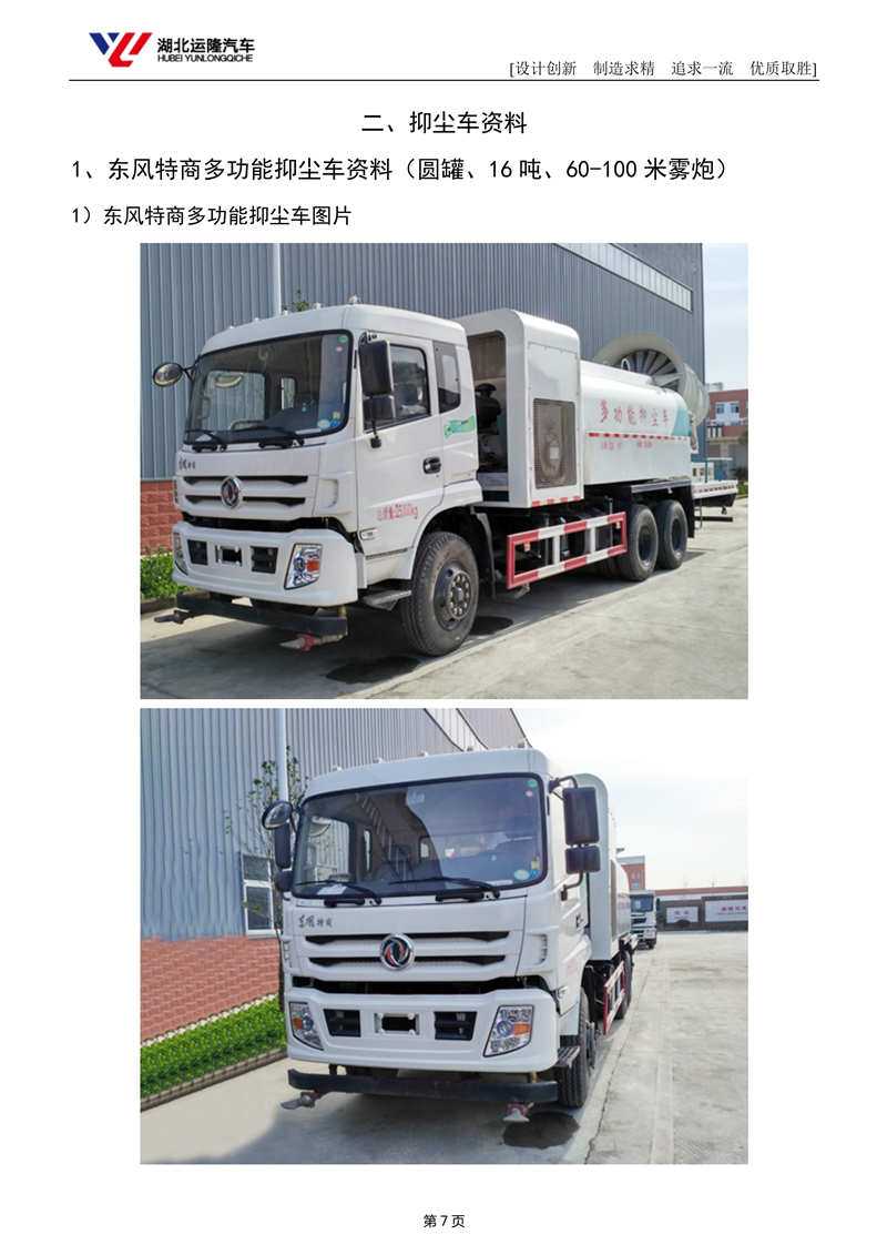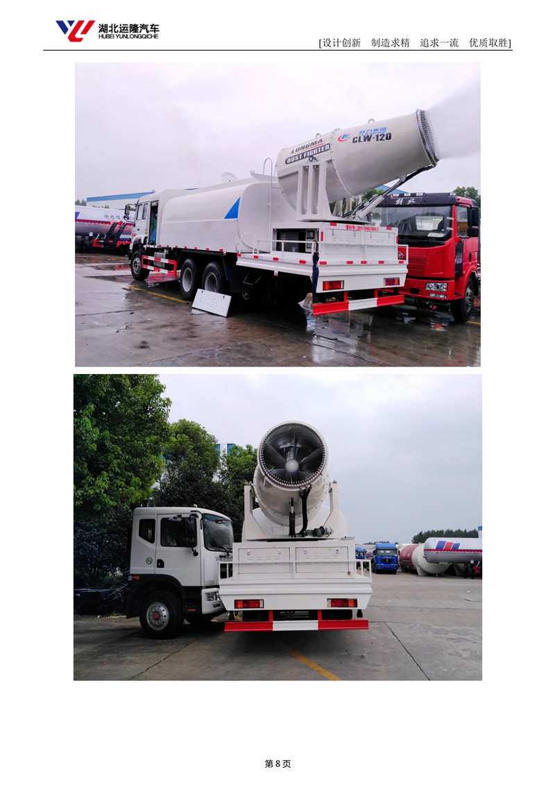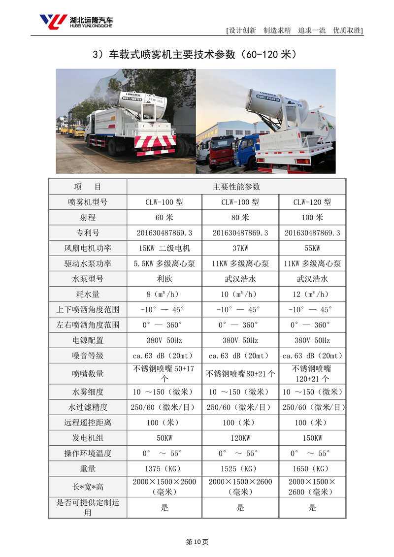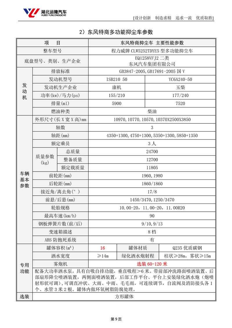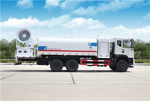 上裝配置:罐體容積為 15-18 立方多功能抑塵灑水車,選配風(fēng)送式霧炮機(jī)組射程50米、60米、80米、100米、120米,罐體鋼板為4mm碳鋼Q235材質(zhì),罐內(nèi)隔板具有防波作用,以減輕汽車行駛時(shí)罐體液體沖擊,罐體及整車外形尺寸按照公告。帶大功率專用灑水泵,泵可自吸自排,整車前沖、后灑、側(cè)噴、帶65消防接口,后平臺(tái)配CLW-50、CLW-60、CLW-80、CLW-100、CLW-120型風(fēng)送式霧炮機(jī)組;罐體前封頭配大功率柴油發(fā)電機(jī)組;遠(yuǎn)程遙控系統(tǒng)控制;霧炮機(jī)自動(dòng)旋轉(zhuǎn)角度0-360°。后平臺(tái)帶綠化灑水炮,灑水炮可全方位旋轉(zhuǎn),可連續(xù)調(diào)成直沖狀、大雨、小雨、毛毛雨;前封頭帶水位計(jì),后平臺(tái)主管路帶1寸澆花接口,后爬梯帶兩根輸水管及陰陽(yáng)端。罐體顏色:銀/灰/綠,罐體兩側(cè)噴“多功能抑塵車”字樣,貼反光標(biāo)示。